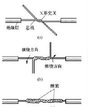 先將兩導(dǎo)線的芯線線頭作X形交叉,再將它們相互纏繞2~3圈后扳直兩線頭,然后將每個線頭在另一芯線上緊貼密繞5~6圈后剪去多余線頭即可。